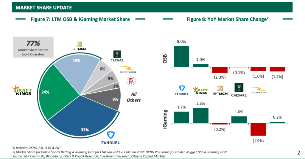In terms of online casino sites, FanDuel (up to 1.7 percent) and DraftKings Casino (up to 2.3 percent) have further tightened their grip year over year, while BetMGM (down 0.2 percent) took a small step backward.